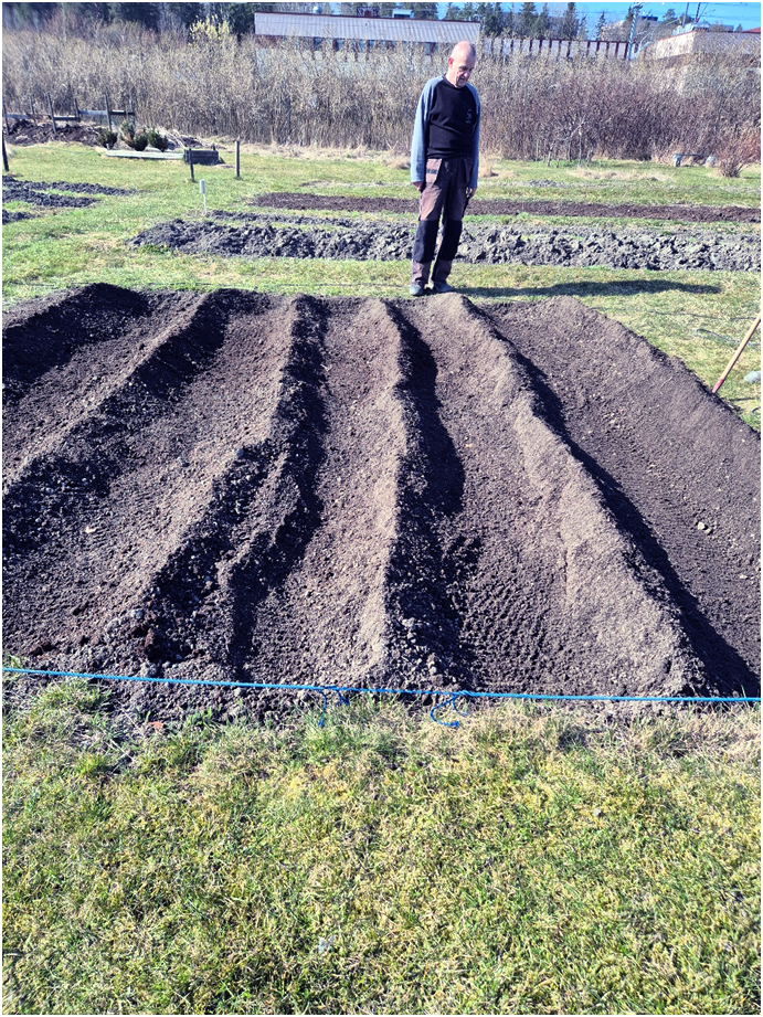 Här har ett av potatislanden gjorts i ordning med jordfräsen. Nu ligger en säck sättpotatis i arbetsboden, men vilken dag som helst kommer de i jorden. Och efter en tid är de välsmakande färskpotatis.